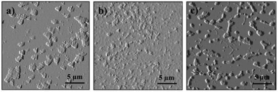 AFM imaging was used to assess the extent of aggregation and subsequent precipitation of model 1 and model 2 under the influence of commercially available chemical additives normally used as part of the multiple strategies for flow assurance (Figure 3, Figure 4, Figure 5, Figure 6 and Figure 7). In this case, only one of the inhibitors (PIBSA) and one of the dispersants (APR) were used. Results indicated that the inhibitor produced final states (AH and MSR after evaporation) that are smaller in size compared to the system without additives, which means that the inhibitor is capable of reducing the density of the formed complex and prevents it from further growth. Similarly, the dispersant produced final states greater in size compared to the system without additive, suggesting a type of thickening of the media which could hinder cluster mobility, hence further aggregation.