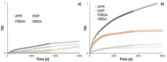 TSI as a function of time for the inhibitors/dispersants acting on (a) model 1 and (b) model 2.