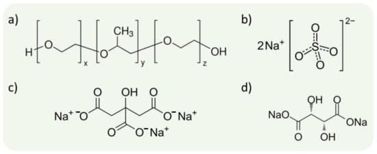 Molecular structures—(a) Pluronic L64; (b) Sodium sulfate; (c) Sodium citrate; (d) Sodium tartrate.