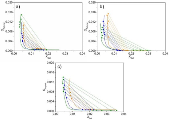 The polymer and salt mass fractions in the PRP and SRP in each tie line were determined through Equations (1)–(4) using the Solver program of Microsoft Excel. The method proposed by Merchuk et al. [] considered the ratio between the mass of the polymer-rich phase and the total initial mass of the mixture, according to Equation (5). The Statgraphics software adjusted the parameters of Equations (3) and (4).