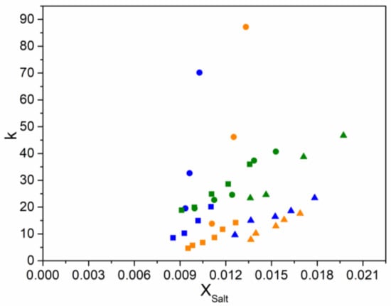 where z—Anion charge, —Avogadro number, —Thickness of immobilized water spherical shell surrounding the ion, r—Effective radius of anions determined by the apparent molar volume at 298.2 K. Values equal to 72.0 , 60.1 [] and 36.5 [], respectively for , , and (Table S2).