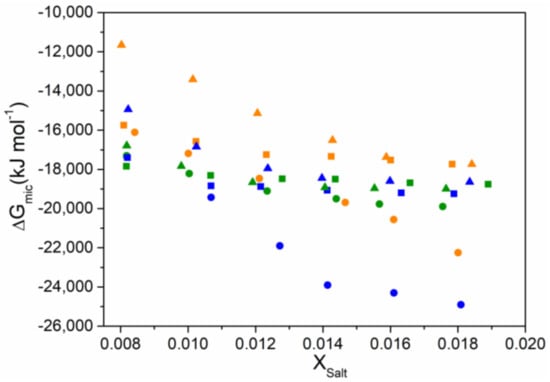 Gibbs free energy of micellization for systems with Pluronic L64 + water + sodium sulfate at pH (●) 5.0, (●) 7.5, and (●) 10.0; Pluronic L64 + water + sodium citrate at pH (■) 5.0, (■) 7.5, and (■) 10.0; Pluronic L64 + water + sodium tartrate at pH (▲) 5.0, (▲) 7.5, and (▲) 10.0.