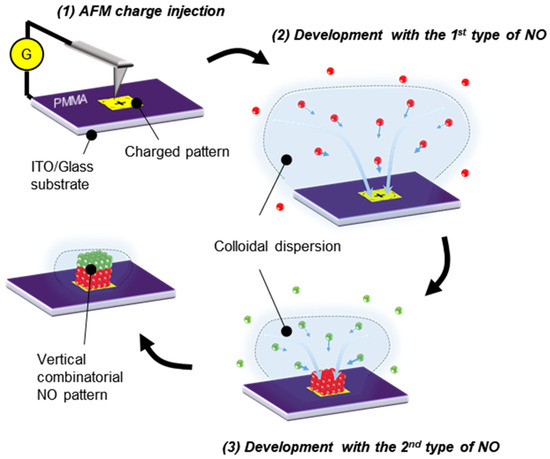 The vertical combinatorial electrostatically directed assembly of colloidal nano-objects on surfaces presented in this work was performed by atomic force microscopy (AFM) nanoxerography [21,23]. Figure 1 illustrates the three main steps of the proposed concept. The initial injection step consists in writing charged patterns of desired geometries on an electret surface using a polarized AFM (ICON from Bruker, Germany) tip (1). Then the charged substrate is put in contact with a first colloidal dispersion of interest for a few seconds before being naturally dried. During this first development step, NOs attracted by the electrostatic forces generated by the charged patterns, are selectively assembled on them, forming a multilayered microstructure (2). Then the same sample is put in contact again for a few seconds with a second colloidal dispersion, which creates a second level of NOs selectively deposited on top of the first one (3). The main point is to stop the first assembly building quite quickly to prevent NOs from reaching the highest possible assembly thickness, which corresponds to the ultimate screening by NOs of the electric field generated by the charged patterns [24]. Consequently, the resulting first assembly only partially screens the electric field, which remains strong enough to attract, on top of the first level of NOs, a second type of NO. After a last drying, a selective combinatorial pattern featuring vertically stacked multilayers of two types of NOs is thus obtained.