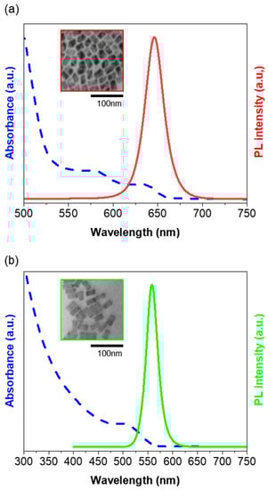 To make the proof of principle of this combinatorial NO assembling method, we have selected 27 nm × 17 nm × 8 nm and 27 nm × 13 nm × 4 nm quantum nanoplatelets (NPs) with different sulfur content in the core, CdSe(S)/CdZnS, dispersed in octane emitting in the red and green wavelengths, respectively. Their chemical synthesis was adapted by the Nexdot company on the basis of previously published protocols to be compatible with nanoxerography [25,26]. Our previous work demonstrated that these types of NOs are very sensitive to dielectrophoretic forces and can be efficiently and selectively assembled in multilayered patterns using nanoxerography [24]. Typical scanning electron microscopy (SEM) images along with emission and absorption spectra obtained from these two colloidal dispersions are shown in Figure 2. Absorption spectra were recorded on a Cary 60 UV-visible single-beam spectrometer (Agilent Technologies, CA, USA), while photoluminescence (PL) spectra were obtained with a FP 8500spectrofluorometer (JASCO, Tokyo, Japan), with λexc = 350 nm. The photoluminescence quantum yield (PLQY) of the NPs in dispersion was determined (with a 5% error bar) by using the Quantaurus-QYPlus absolute photoluminescence quantum yield C13534 spectrometer (Hamamatsu, Japan) equipped with an integrating sphere, with λexc = 460 nm.