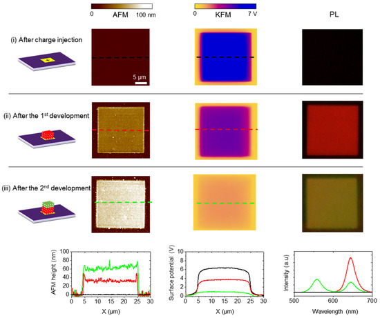 Atomic force microscopy (AFM), Kelvin Force Microscopy (KFM), and photoluminescence (PL) mappings at various stages of a vertical combinatorial assembly by AFM nanoxerography of red and green NPs on a 20 µm charged square pattern. The lateral scale is identical for all pictures. The corresponding AFM/KFM profiles and the PL spectra are reported in various colors depending on the protocol step: black after charge injection, red after the first assembly of red NPs, and green after the second assembly of green NPs.