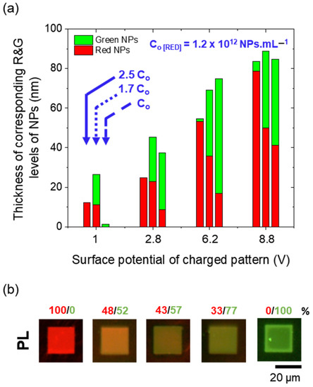 Figure 4a reports the respective thicknesses of both red and green NP levels in vertical combinatorial multilayered patterns obtained by AFM nanoxerography in various conditions. The concentration of the used green NP dispersion for the second assembly was fixed at 1.2 × 1012 NPs.mL−1, while the surface potential of the charged pattern and the concentration of the red NP dispersion used for the first assembly were varied. The development time for both dispersions was fixed at 15 s.