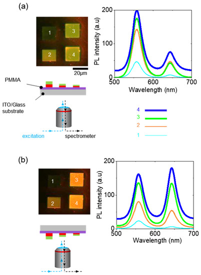 PL mapping and corresponding spectra of four co-assembled squares (initially charged with voltage pulses ranging from +40 V to +80 V, from 1 to 4), composed of a first red NP level with a second green NP level on top, where measurements were made from (a) the substrate side and (b) the assembly side. The scale bar is identical for both sets of PL images.