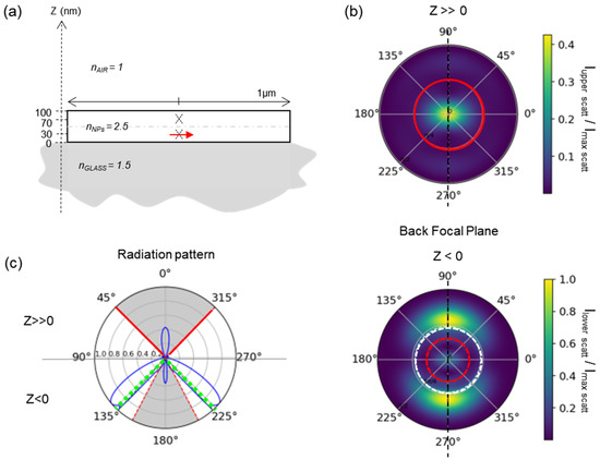 Figure 6c presents the radiation pattern corresponding to a cross-section along the black dashed line drawn in Figure 5b. It highlights the two central lobes (θ = 0°) gathered within the collection objective angle, one in each half space. In the lower half space (z < 0), the two large lobes close to the (TIR) angle are not collected. The ratio K corresponding to the collected intensity in the upper half space over the collected intensity in the lower one gave a value of 2.2. It thus points out that there was more collection in the upper half space than in the lower one. If a dipolar source emitting in the green region at a wavelength = 555 nm is now placed in the upper position of the stack (at a position z = 70 nm from the substrate), K turned to 0.6, meaning that there is more collection in the lower half space in that case.