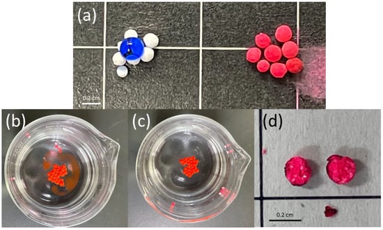 The hydrophobicity of polymer particles can be investigated by confirming the behavior of aqueous or organic droplets when they are contacting the polymer particles. When the aqueous droplet is placed on the hydrophilic polymer, the droplet penetrates the hydrophilic polymer, while the organic droplet is repelled. In the case of the hydrophobic polymer, where the aqueous droplet is repelled, and the organic droplet penetrates the hydrophobic polymer. As shown in Figure 4, the hydrophobicity of pTrim cryogel particles was investigated. Herein, the behavior of droplets, aqueous (dyed as blue), and organic (dyed as red) was placed on the pTrim cryogel particles and observed (Figure 4a). As the result, the aqueous droplet was repelled from the pTrim cryogel particles, whereas the organic droplet penetrated the particles. As stated previously, the cryogel particles presented here comprise pTrim and thus have a hydrophobic surface. Subsequently, the adsorption of organic solvent in the oil–water system by pTrim cryogel particles was examined in Figure 4b,c. Cyrogel particles were added to water containing the red-dyed organic solvent. As shown in Figure 4b, three seconds after the addition of the particles, the particles floated to the liquid surface, resulting in aggregate formation. Furthermore, the particles rapidly started to adsorb the dyed organic solvent. Eventually, the particles were found to adsorb all organic solvents in the beaker after only 10 s (Figure 4c). After the adsorption of organic solvent, pTrim cryogel particles were removed from the water and cut in half; the appearance of cross section was then then observed (Figure 4d). It was confirmed that the pTrim cryogel particle was colored red, including the interior side from the image of the cross section. Hence, the adsorbed organic solvent was diffused through the interior of the particle. It is expected that the porous structure of the pTrim cryogel particle has pores running from the exterior to the interior of the particle and monolithic structure. These results are supported by the evidence that the monolithic porous structure was formed in the pTrim cryogel particle (Figure 3). The pTrim cryogel particles were thus shown to have the potential to be applied as a separation material because of their permeability function with the expansive monolithic porous structure.