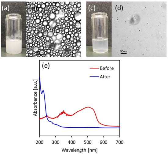 Separation of stabilized emulsion by using pTrim cryogel particles. Before separation of (a) photograph of the emulsion in bulk scale and (b) optical microscope image, and after separation of (c) photograph of the emulsion in bulk scale and (d) optical microscope image. (e) UV-vis spectra of emulsion.