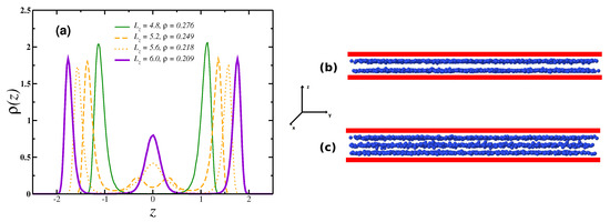 We can imagine the 2D limit as a single-layer limit. In this sense, we have investigated systems with two, two-to-three, or three layers of confined CS colloids, depicted by their transversal density profiles in Figure 2a. Layers near the walls are called contact layers, while the others, if they exist, are called central layers. Systems with two well-defined layers are observed for the most densities explored for plates separated by and , while three well-defined layers occur for to . Intermediate values of lean over to present a transition between two-to-three layers for most densities simulated. In Figure 2b,c we show examples of snapshots of systems with two () and three () well-defined layers, respectively.