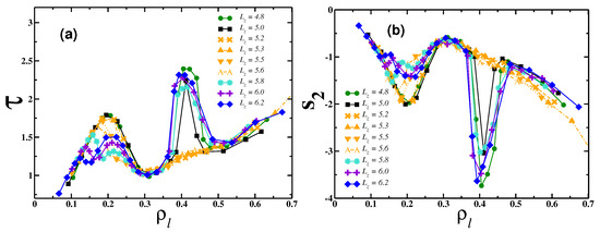 The central layers also were analyzed for the separations from to . Pores with a separation of have two layers, or a transition between two-to-three layers. In Figure 7a,b, we show both the translational order parameter and two-body entropy as a function of the central layer’s density, respectively. As already observed for contact layers, systems at , , and that present order–disorder transition have anomalous behavior around , while systems at and , presenting frustration due the hopping of particles between layers, does not show anomalous behavior. The results for the central layers are evidence that 2D-like behavior at high densities is connected to the movement in the confined direction.