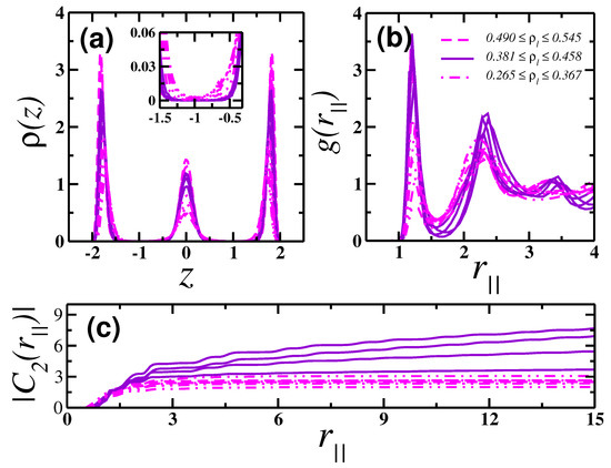 The same behavior was found for another system that presented 2D-like behavior at high densities, , shown in Figure 5. The solid violet lines correspond to densities in the region of ordered particles (third maximum in and minimum in ), . The dashed magenta lines correspond to some densities above the maximum in and minimum in , , while the dashed-dotted magenta lines correspond to some densities below the maximum in and minimum in , . Despite the fact that the colloids here are arranged in three well-defined layers, as seen in Figure 5a and its inset graph, the basic mechanism behind the structural anomalous region is the same as the one found in the previous case, Figure 4. Both and indicate a order–disorder transition in the contact layers, as we can see in Figure 5b,c, respectively. Therefore, the origin is the same as the one observed in the 2D system: an ordered–disordered transition leads to the water-like structural anomaly.