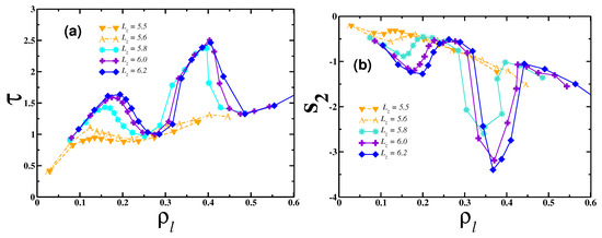 Another quantity analyzed was the two-body entropy, which gives us structural information, because its definition is based on the radial distribution function (Equation (5)). Normal fluids lean over to present values of that monotonically decrease with density. also presents anomalous behavior in 3D and 2D bulk and 3D confined systems. Two regions of anomaly in were already shown in the past for until . Now, going to higher layer densities, we found the profile seen in Figure 3b. In the current work, we explored higher densities and found 2D-like and 3D-like behaviors, depending on the studied. As observed for the translational order parameter, also presented a 2D-like behavior at high densities () for , , , , and and a 3D-like behavior for , , , and .