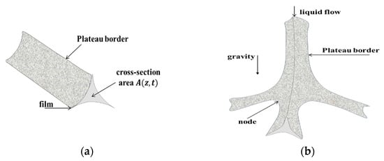 In past decades, the dynamics of foam drainage were extensively studied. Generally, the scales of such studies were greater than a consideration of individual bubbles; i.e., the liquid fraction was more thoroughly considered in quantifying the drainage of aqueous foams (a continuum approach). Accordingly, the drainage equation has been a popular model for describing the liquid flow in the channel-like network of foams as a function of time. In aqueous foams, the liquid flow occurs via three paths: the films between two neighboring bubbles, the junctions of three adjoining films called the Plateau border channel, and the junctions of four Plateau borders, called nodes (see Figure 1). Two principal assumptions were considered to derive the drainage equation in the standard form. The first assumption was that the effects of liquid flow in films are negligible, so the drainage occurs through the Plateau borders. The second assumption was that the liquid flow is inside a rigid channel; i.e., a no-slip boundary condition was supposed. In fact, a Poiseuille flow was assumed in the channels formed between the bubbles. It has been recommended that an assumption be made that the liquid flow in foams is analogous to the flow through a porous medium such as a solid sphere [5,29]. In this way, the dissipation can be described using Darcy’s law.