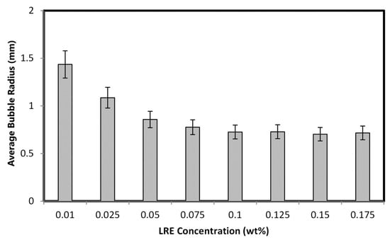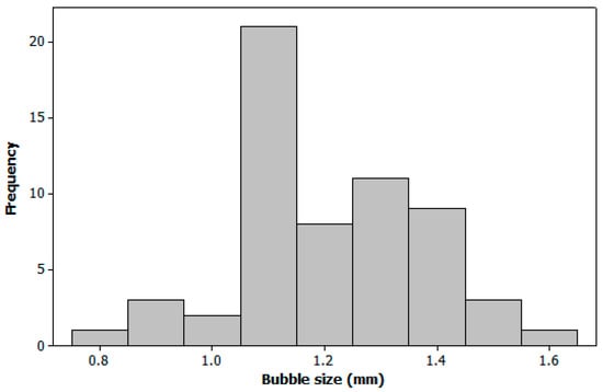 In the present study, given that the bubbles were nearly spherical, the mean bubble diameter was computed by surface area obtained from the bubble size distribution, as presented in previous literature [39,40]. Therefore, assuming that the bubbles were spherical, the mean equivalent diameter was determined using the surface area of each bubble, as provided using image processing. For example, the diameter distribution of the LRE foam prepared from a 0.15%wt solution is provided in Figure 4. This figure shows that bubble sizes varied from 0.8 to 1.6 mm, although the diameter of most bubbles ranged from 1.1 to 1.4 mm. In addition, it was observed that the maximum bubble size was about 1.1 mm, followed by 1.3 and 1.4 mm. Finally, the mean bubble diameter of this foam was determined to be 1.32 mm.