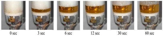 The target of this investigation was to compare the drainage behavior of LRE foams with the simplified theoretical modeling, as presented above. In the experimental part, the amount of drained liquid was measured as a function of time until the foam was completely collapsed. As an example, six snapshots during the foam decay process for a sample LRE solution (concentration of 0.15 wt%) are shown in Figure 6. In these photos, the dashed line shows the amount of liquid drained in the previous image to better understand the rate of drainage. It was experimentally observed that the drainage rate at the beginning of the process was higher.