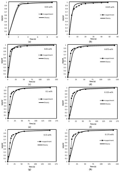 Figure 7 shows the time-dependent drainage data, together with the theoretical modeling results, for the foams generated from eight different LRE solutions (0.01, 0.025, 0.05, 0.075, 0.01, 0.0125, 0.015, and 0.0175 wt%). The drained volume is shown as a function of time normalized by the total volume drained from the foam, Vf. We can see that the observed drainage behavior is similar to the predicted curves obtained from the analytical solution of Equation (18) for 1/2. The initial drainage rate is high and approximately constant, followed by a reduction as the process continues. Adopting 0.5 for the index of the dissipation mechanism revealed that in the LRE foams, shear flow occurred in the junctions; accordingly, node dissipation was the dominant mechanism.