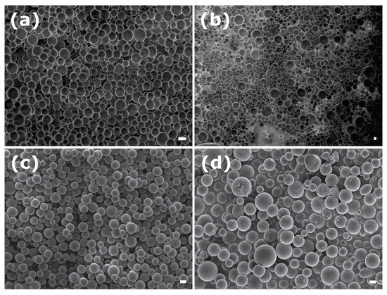 SEM images of solidified spherical polymeric particles in emulsion: (a,c) without gel; (b,d) in the gel. The upper row corresponds to samples E8 and EG8, and the lower row to samples E5 and EG5. Scale bars = 1 m.