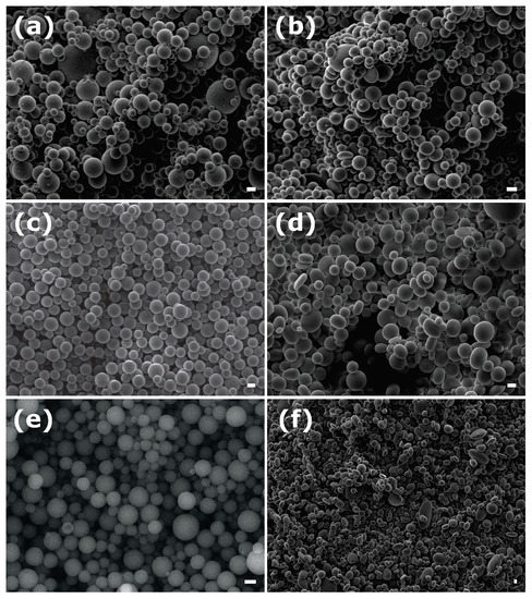 SEM images of spherical polymeric particles solidified in emulsion (left column) and their corresponding deformed particles (right column): (a) E1, (b) EGD1, (c) E5, (d) EGD5, (e) E6, and (f) EGD6. Scale bars = 1 m.