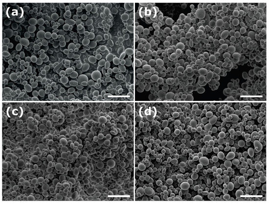 SEM images of fractions of deformed particles obtained by centrifugation for 3 min at: (a) 400 (11× g), (b) 500 (18× g), (c) 650 (30× g), and (d) 800 (45× g) rpm. Scale bars = 10 m.
