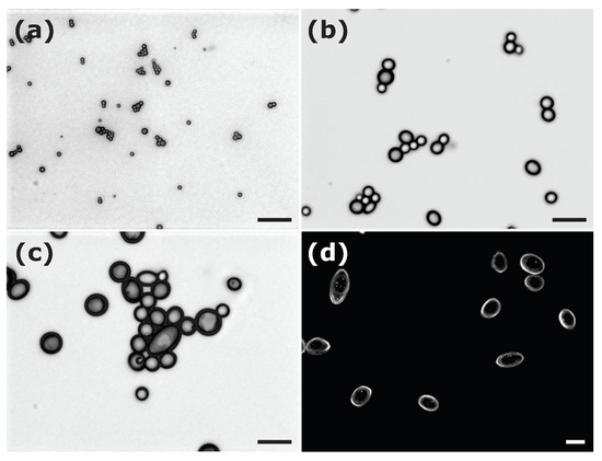 Light microscopy images of fractions of deformed particles obtained by iterative differential centrifugation: (a) EGD5F1 (1115× g; 5 min), (b) EGD5F2 (1115× g; 1 min), (c) EGD5F3 (865× g; 1 min), and (d) EGD5F4 (70× g; 1 min). Scale bars = 10 m.