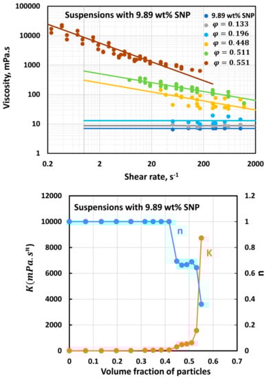 Viscous flow behavior of suspensions at different volume fractions of solids ( at a fixed SNP concentration of 9.89 wt%.
