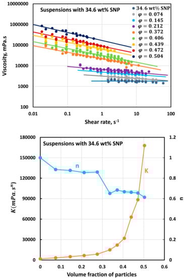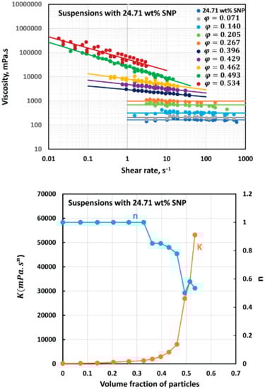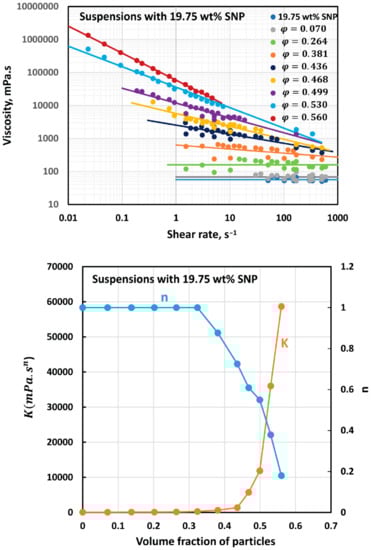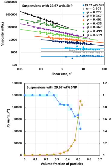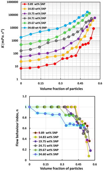 The increase in consistency index with the increase in volume fraction of particles is expected as the particles act as obstacles to flow resulting in an increase in flow resistance and consistency. Increasing the SNP concentration of suspension at a fixed volume fraction of particles, the viscosity of the matrix fluid is increased (see Figure 4). It is well-known that the viscosity of suspension is directly proportional to the viscosity of matrix fluid []. Therefore, the viscosity and hence consistency index of suspension increases accordingly.