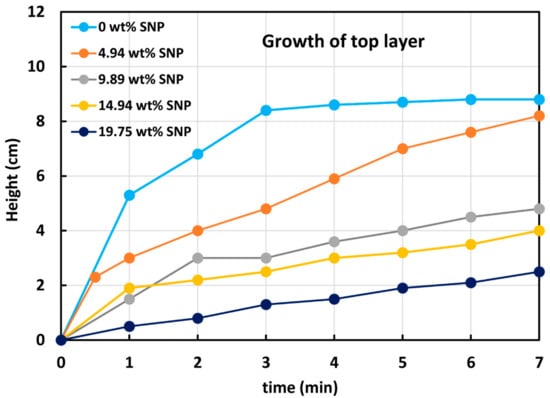 Growth of top creamed layer of SG hollow spheres with time in a suspension (25 wt% particles) with different SNP concentrations of the matrix phase.