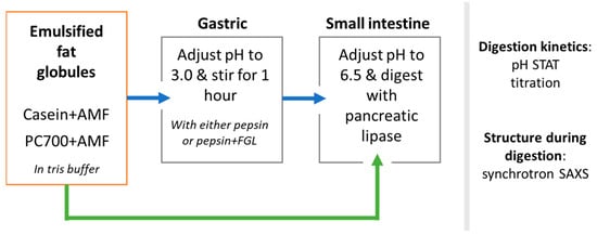 In this study, we investigate the impact of milk-based emulsifiers on the digestibility and self-assembled liquid crystal structures of lipid emulsions using anhydrous bovine milk fat (AMF) as the nominal triglyceride core. It is worth noting that, whilst in vitro digestion of lipids and the impact of emulsifiers on digestibility of the lipid droplets in gastric and small intestinal conditions have been widely investigated [25,26,27], studies relating the interfacial composition to liquid crystalline structure formation mentioned in the previous paragraph are absent, even though such findings are important when considering a selection of emulsifiers during the development of milk lipid-based formulations. Casein and milk phospholipids are used as the emulsifiers in this study because casein is a milk serum protein [28] and milk phospholipids are important components in MFGM [29,30,31]. The complex mixture of components in MFGM has been shown to pose various health benefits, including modulating gut microbiome and enhancing the intestinal epithelial barrier function [32,33], and has thus been increasingly supplemented in infant formulas and other functional foods [34]. Small angle X-ray scattering (SAXS) was the technique used to probe the evolution of liquid crystal structures during digestion. Effects of gastric digestion on the structure formation by the digesting lipids under small intestinal conditions were also studied to understand potential changes that occurred at the oil/water interface following gastric pre-treatment. Schematic representation of the concepts of this study are summarised in Figure 1.
