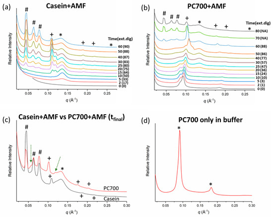 SAXS profiles of anhydrous milk fat (AMF) emulsified by (a) casein and (b) milk phospholipids (PC700) at 2 w/v% as a function of digestion time in min, and brackets contain the average extent of digestion at that time point in mol% (ext. dig) expressed as a % of triglycerides digested under small intestinal conditions at pH 6.5. NA = ext.dig was not measured beyond 1 h digestion time. Pancreatic lipase was injected at time 0 min. Diffraction peaks characteristic of lamellar phases were labelled as *, hexagonal phases as +, and bicontinuous cubic Im3m phases as #. (c) SAXS profiles of casein + AMF and PC700 + AMF at the conclusion of digestion (60 min for casein and 80 min for PC700) were shown for comparison purposes. Dashed arrows point to an additional lamellar phase that was formed after digestion. (d) Characteristic SAXS pattern of multilamellar vesicles formed by PC700 in buffer (no AMF) at 2 w/v% concentration. Polarised microscopy image of hydrated PC700 and the cryogenic electron microscopy image of dispersed PC700 supporting the SAXS profiles are presented in Figure S2 in the Supplementary Materials section.