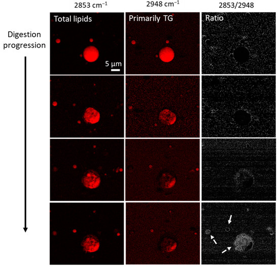 Images from CARS microscopy of PC700-emulsified fat globules during digestion (from top to bottom) by pancreatic lipase, showing distributions of triglycerides (TG, middle column) and all lipids, including the digestion products (left column), and the ratio between the two signals (right column). Time between each acquisition was about 5 min, and the first image was acquired about 5–10 min after lipase injection. The progression of digestion did not represent the actual digestion time scale, and it is worth noting that the extent of lipolysis for individual droplets was not identical, and the pH of the samples were not controlled. White arrows point to the accumulation of digestion products.
