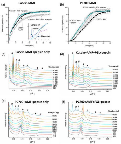 Extent of digestion of anhydrous milk fat (AMF) globules emulsified with (a) 2 w/v% casein and (b) 2 w/v% milk phospholipids (PC700) under simulated small intestinal conditions at pH 6.5 with no gastric pre-treatment, post-pepsin treatment, and post-fungal gastric lipase (FGL) + pepsin treatment. Inset in panel (a) shows the expanded digestion profile for casein + AMF from 0–3 min where pre-digestion of casein + AMF with pepsin reduced the duration of the lag time for the onset of digestion. Digestions were performed in triplicate (n = 3 ± standard error of mean). SAXS profiles of (c,d) the casein-emulsified fat globules and (e,f) the PC700-emulsified fat globules as a function of digestion time (min) and the corresponding average extent of digestion in mol% (ext. dig) after exposure to pepsin and FGL + pepsin. Lipase was injected at time = 0. Peaks characteristic of lamellar phases were labelled as *, hexagonal phases as +, and bicontinuous cubic Im3m phases as #.