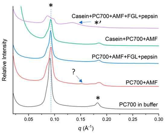 Figure 9 compares the SAXS profiles of PC700 in tris buffer (no AMF) and in milk fat emulsions with and without gastric digestion after pH adjustments to 6.5. Amphiphilic phospholipid components in the PC700 self-assembled into a lamellar/vesicular structure (q = 0.09 and 0.18 Å−1) in tris buffer with lamellar repeat distances of about 69 Å. The lamellar structure was still observed after emulsification with fat globules, but interactions between the PC700 components and the non-polar milk triglycerides resulted in broadening of the lamellar peaks and a slight increase in the q values. The self-assembled structure of PC700 remained similar after incubation of fat globules with fungal gastric lipase and pepsin, provided that no gastric lipolysis occurred, as was the case in the mixed emulsifiers system.
