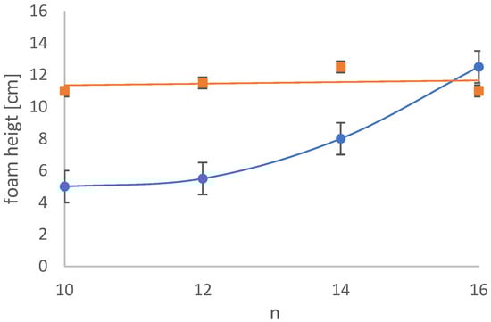 Figure 1 presents the maximum foam height as a function of the number of carbon atoms (n) for both pure TAB and TAB–SiO2 mixtures, with the surfactant concentration fixed at 1 × 10−3 mol/L. From the figure, it is evident that the foam height was generally higher for the composite (TAB–SiO2 mixtures) compared to the pure surfactants. However, for , the foam height was not increased by the addition of silica nanoparticles.