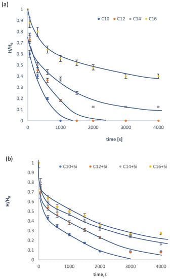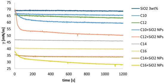 In Figure 8, the dynamic interfacial tensions of the TAB and TAB–SiO2 NP mixtures at a fixed surfactant concentration of 1 × 10−3 mol/L are shown. The results demonstrate a reduction in the surface tension for the mixture compared to the pure surfactant solutions. All solutions of the pure TABs showed an almost constant surface tension from the beginning, which means that, even after only a few seconds, the adsorption of the surfactant molecules had reached equilibrium. Due to the large differences in surface activity, the absolute values were lowest for and highest for TAB. In contrast, when SiO2 particles were added to the respective surfactant solutions, the dynamic surface tension curves first decreased and then leveled off at the respective equilibrium surface tension. The much slower change in surface tension points to the fact that the surfactant molecules did not adsorb, but complex particles, i.e., the SiO2 particles, were modified via the electrostatically bound cationic surfactants. The particles modified by the longest chains C16 were the most hydrophobic ones, and, hence, led to the lowest surface tension values. Aidarova et al. [], in their study, obtained a similar result for polymers decorated by surfactants with longer hydrophobic chains, which required more time to reach a final value due to the slow diffusion of the polymer/surfactant complexes.