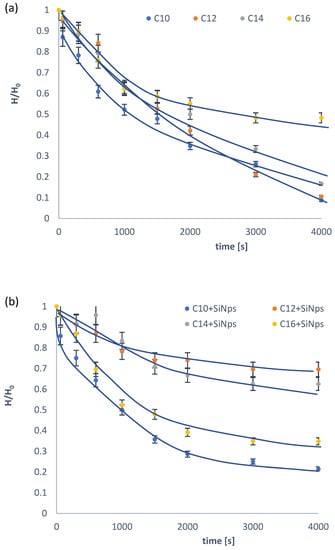 Normalized foam height (H/H0) as a function of time for (a) pure TAB aqueous foams and (b) TAB–SiO2 nanoparticle dispersions at a fixed surfactant concentration of 10−3 mol/L.