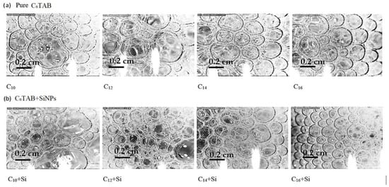 The images shown in Figure 5a,b provide additional information on the physical characteristics of the foam generated from solutions of pure surfactants and the TAB–SiO2 mixtures. The observed decrease in bubble size with increasing surfactant chain length can be attributed to the decrease in surface tension. In contrast, the TAB–SiO2 mixture foams exhibited more uniformly spherical bubbles that were densely packed. This suggests that the addition of SiO2 NPs may act as stabilizers, helping to prevent bubble coalescence and, thereby, increasing foam stability. Additionally, the densely packed bubbles indicate that the TAB–SiO2 particles may have a higher surface coverage compared to pure surfactant foams, further supporting the idea that SiO2 NPs can increase foam stability.