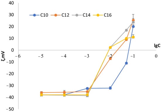 The foamability of the mixtures varied with the concentration and chain length of TAB (Figure 2). Above a concentration of 10−2 mol/L, the foamability for all TAB–SiO2 dispersions sharply increased. This increase in foamability was surely caused by the sufficiently high surface activity of the formed surfactant–particle complexes due to the hydrophobization effect, as well as a sufficient electric charge after the charge inversion provided by the formed second corona. Below a concentration of 10−2 mol/L, the complexes could possess a sufficiently high charge to stabilize the foam films and, thereby, the foam, but the corresponding surface activity was probably insufficient. The unexpected behavior of the surfactant in combination with the SiO2 nanoparticles presented a notable deviation from the trends observed for , , and . One plausible explanation for this particular behavior involves the concept of complete charge neutralization occurring at various surfactant concentrations, depending on the carbon chain length. Notably, shorter carbon chains require higher concentrations for achieving complete charge neutralization. At a concentration of 1 × 10−2 mol/L, it can be postulated that the particles and functional groups of TAB experienced complete charge neutralization, contributing to the observed reduction in foamability. This observation is in line with the noticeable decrease in foamability observed above.