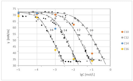The surface tension isotherms of pure TAB solutions (, , , ) in Figure 7 were taken from Mucic et al. []. The resulting curves show a clear dependence on the chain length of the surfactant molecules, with longer chains exhibiting higher surface activity, as expected from the Traube rule. The colored experimental points are data obtained in this work, which agree rather well with the literature data in [].