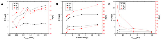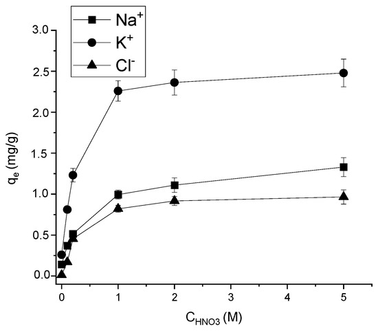 The concentration of acid used for the activation of the silicate is an important factor affecting the adsorption properties of the materials, as well as the cost of the obtained sorbent. The concentration of nitric acid varied from 0.1 to 5 mol/L (Figure 1). An increase in the acid concentration to 1 mol/L significantly raised the adsorption efficiency towards all studied ions. For example, even the lowest amount of acid (0.1 mol/L) increased qe by Na+ ions from 0.14 to 0.37 mg/g. This may indicate a partial dissolution of the components that interfere with the adsorption of ions, as well as an increase in porosity and the specific surface after the interaction of the clay with acid. The concentration sufficient for the most effective improvement of the sorption activity of clay in relation to the studied ions was 1 mol/L. The use of concentrations >1 mol/L was thus economically unfeasible.