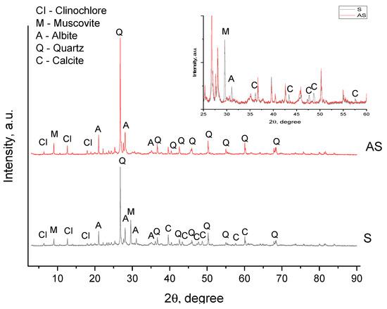 The cation exchange capacity (CEC) of adsorbents represents the number of cations available at a given pH capable of exchanging with other cations. It is usually expressed in milliequivalents per 100 g (meq/100 g) of dry clay. The adsorbed cation replaces or exchanges the initial cation, which balances the charge of the negative layer in the solution. This ability of S particles to retain and exchange positively charged ions is vital as it affects the mobility of positively charged compounds both in soils and in the geochemical cycle of cations in general [53]. The CEC of AS (Table 2, ~168 meq/100 g) was much lower than that of S (~851 meq/100 g). A significant decrease can be seen in calcium and magnesium content due to the partial dissolution of calcite and Ca/Mg hydroxides after acid treatment. The second ion in the CEC ranking was sodium, in accordance with its more facile ion exchange compared to other ions [54,55]. It is interesting that the CEC of K+ increased slightly after acid treatment. This is probably due to the decrease in sodium content that allows K+ ions to enter the ion exchange process.