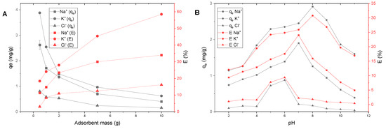 Effect of external factors on Na+, K+ and Cl− adsorption onto AS: (A) adsorbent mass (T = 298 K; = 1 mol/L; pH = 6.85 ± 0.25; C0 (Na+, K+, Cl−) = 100 mg/L; contact time = 3 h); (B) pH (solid/liquid = 1:100; T = 298 K; = 1 mol/L; C0 (Na+, K+, Cl−) = 100 mg/L; contact time = 3 h).
