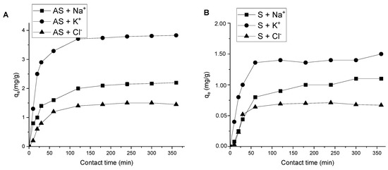Effect of contact time on Na+, K+ and Cl− adsorption onto AS (A) and S (B) (solid/liquid = 1:10; T = 298 K; = 1 mol/L; pH = 6.85 ± 0.25; C0 (Na+, K+, Cl−) = 100 mg/L).
