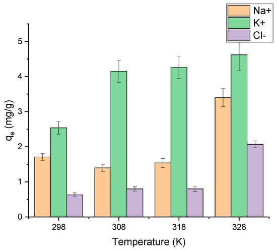 Based on the AREs, the best isotherm for Na+ ions onto both materials was the Freundlich model, i.e., a multilayer adsorption on a heterogeneous surface with energetically unequal sites [40]. For K+ and Cl− ions, the smallest ARE values were obtained for the Dubinin–Radushkevich model. This isotherm is an empirical model, which generally applies to express the adsorption mechanism with a Gaussian energy distribution onto a heterogeneous surface. It characterizes an imperative parameter E as the specific mean free energy, which is utilized to differentiate among physical and chemical adsorption. The Dubinin–Radushkevich model enables the determination of the adsorption energy (J/mol). When the magnitude of E is <8 kJ/mol, the adsorption process is one of physical adsorption, and when E lies between 8 kJ/mol and 16 kJ/mol, the process is chemical adsorption [63]. In the case of both K+ and Cl−, E values were less than 8 kJ/mol. This means that the mechanism of their adsorption was physisorption, particularly ion exchange.