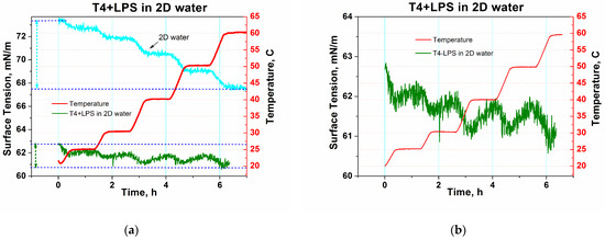 (a) Run of dynamic surface tension vs. time for 2D water and for aqueous solution of T4+LPS at “native pH”. The temperature is increased stepwise in the range of 20 °C to 60 °C. (b) Detailed view of the results for aqueous solution of T4+LPS at “native pH” (pH = 5.7).