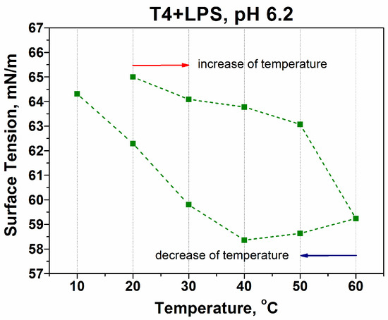 Dynamic surface tension vs. temperature as it is increased and decreased stepwise in the range of 20 °C to 60 °C for aqueous solution of T4+LPS at controlled pH = 6.2.