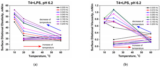 The runs of the dynamic surface tension results of the pure 2D-water system and of T4+LPS systems at “native pH” in the range of 20 °C to 60 °C, are presented in Figure 1a. Note that the values for water are in accordance with well-known published data, e.g., [22]. A more detailed examination of the outcomes reveals the following peculiarities: (i) The overall change in surface tension values is ~1 mN/m for the T4+LPS solution; this is in contrast with the drop of ≥5 mN/m for 2D pure water. (ii) While the increase in temperature produces an initial decrease in the surface tension as expected, keeping the attained temperature in the course of one hour results in a somewhat reversed run of the surface tension for the T4+LPS solution, striving to recover the primary value at the previous temperature step (Figure 1b); this tendency is intensified at higher temperatures. These outcomes evidence the stable presence of amphiphilic entities in the T4+LPS samples during the heating–cooling cycle.