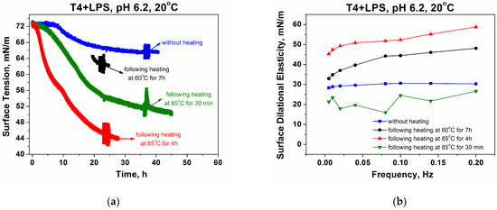 Some test experiments were also performed, with heating to temperatures of 85 °C. The obtained data are presented in Figure 5a,b. The system was then kept either for 30 min, 1 h, or 4 h at 85 °C before performing the cooling procedure. As can be seen, with keeping the mixed T4+LPS system in the course of 4 h at 85 °C, a sharper decrease in the surface tension following the cooling procedure to 20 °C is registered, and considerably lower final surface-tension values are reached, as compared to the case of a system initially retained for 30 min at 85 °C and also juxtaposed with a dynamic surface tension run in the samples without heating (Figure 5a). Some of the results for 20 °C, obtained following heating to temperatures of 60 °C and consecutive cooling according to the already described procedure (see Figure 3), are included in Figure 5a for comparison.