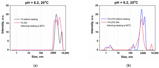 Mean size distributions by intensity of the scattered light for buffered aqueous solutions. The experiments were performed at a temperature of 20 °C before and after the heating–cooling procedure in the range of 20 °C to 85 °C and pH = 6.2. The initial incubation time of T4 solutions was 24 h and of LPS solutions was 2 months. (a) T4 solutions at concentration C(T4) = 2 × 10−4 mol/L; (b) mixed solutions of T4 and Ra LPS from E. coli EH100 at concentrations C(T4) = 2 × 10−4 mol/L and C(LPS) = 0.5 µg/L.
